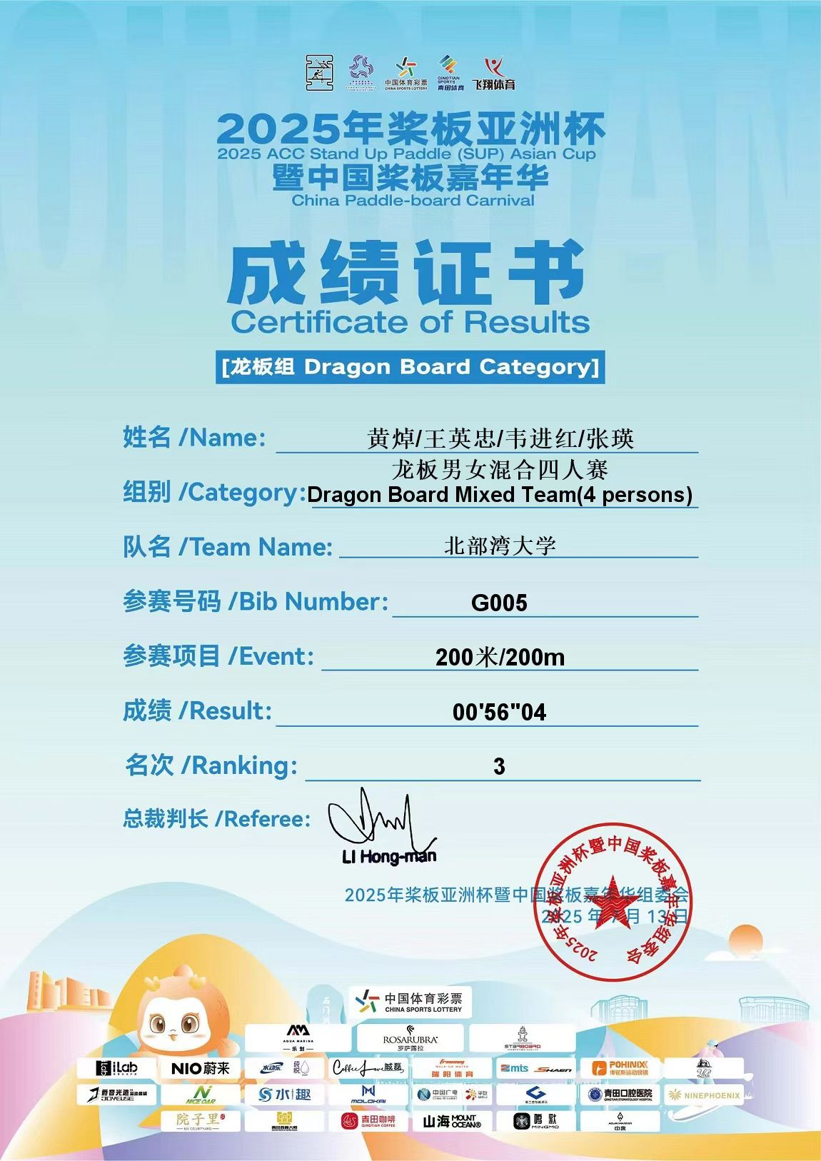 7月13日,2025年亚洲杯国际桨板赛在浙江青田圆满落幕。经过激烈角逐,由黄焯、王英忠、韦进红、张瑛四名学生组成的我校代表队在200米龙板男女混合四人赛中斩获铜牌。这是学校桨板队首次获得国际级比赛奖项。