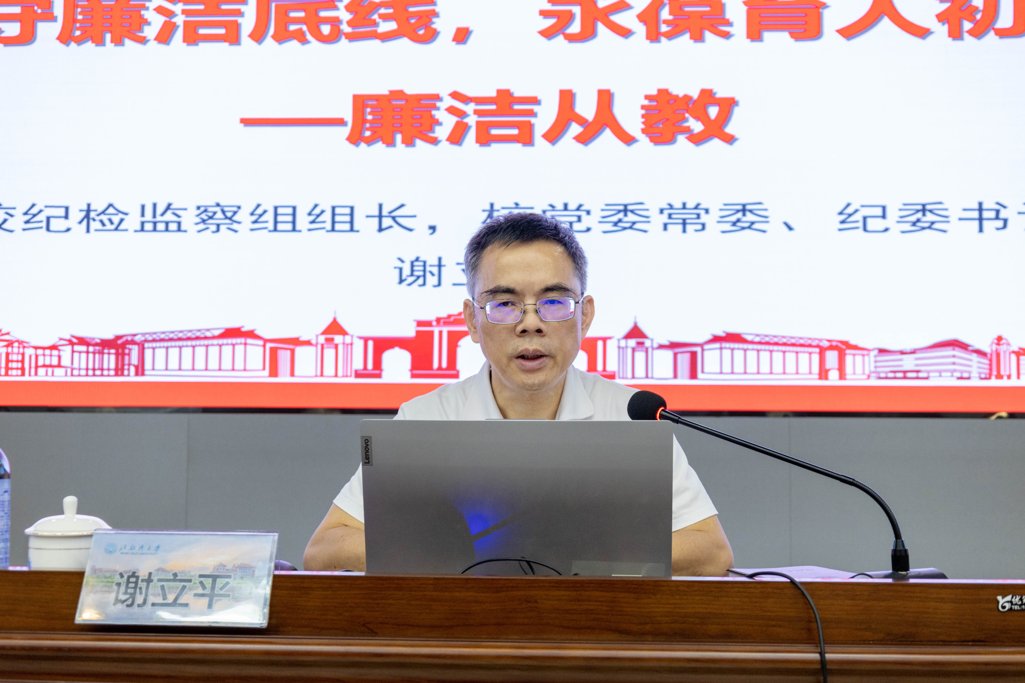 谢立平围绕“廉洁从教”主题,深入解读其核心内涵,并结合高校教师队伍中出现的廉洁风险案例进行剖析,引导新教职工强化身份意识、注重自我修养,坚持高标准、严要求,争做廉洁从教的表率。