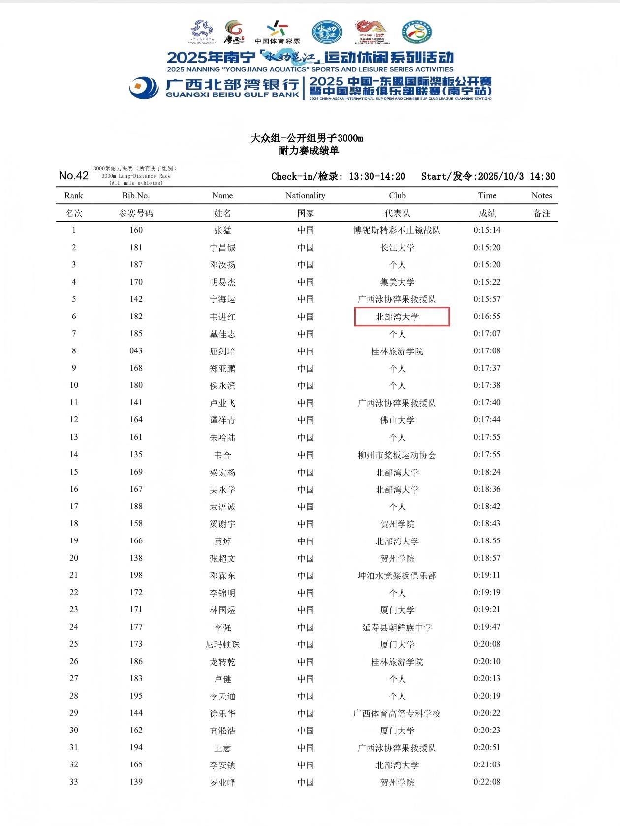 据悉,本次赛事由中国国家体育总局水上运动管理中心、广西壮族自治区体育局和南宁市人民政府共同主办,设置专业组、大众组、绿城组等多个组别,均为个人赛,小项分男子、女子200米竞速赛和3000米长距离竞速赛。北部湾大学桨板队奋勇争先、毫不示弱,在比赛中勇夺佳绩,于粼粼波光中展现了新时代大学生良好的竞技风采。