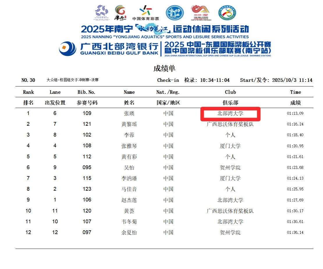 10月3日,2025中国—东盟国际桨板公开赛暨中国桨板俱乐部联赛(南宁站)在南宁市南湖公园圆满落幕。本次赛事汇聚国内外约700名选手同场竞技。北部湾大学桨板队在领队唐明欢与主教练宁志的带领下发挥出色,斩获大众组-校园组200米冲刺赛男、女双项冠军等多项佳绩,充分展现了我校学子顽强拼搏、昂扬向上的精神风貌。