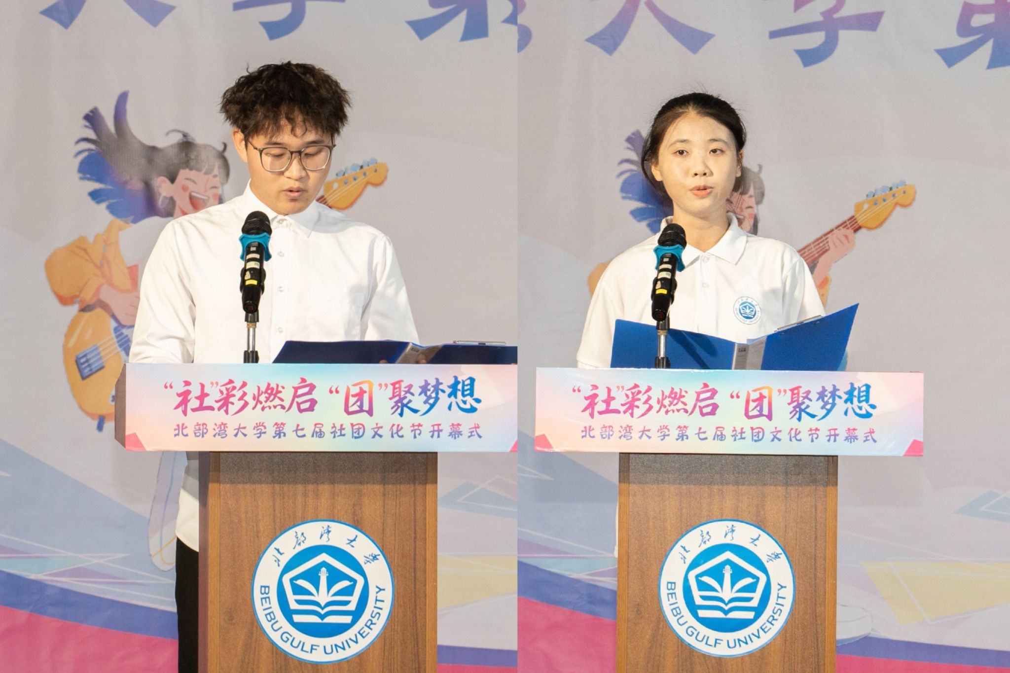 学生社团管理中心代表吴良茂(左)、学生社团代表胡惠岚(右)发言