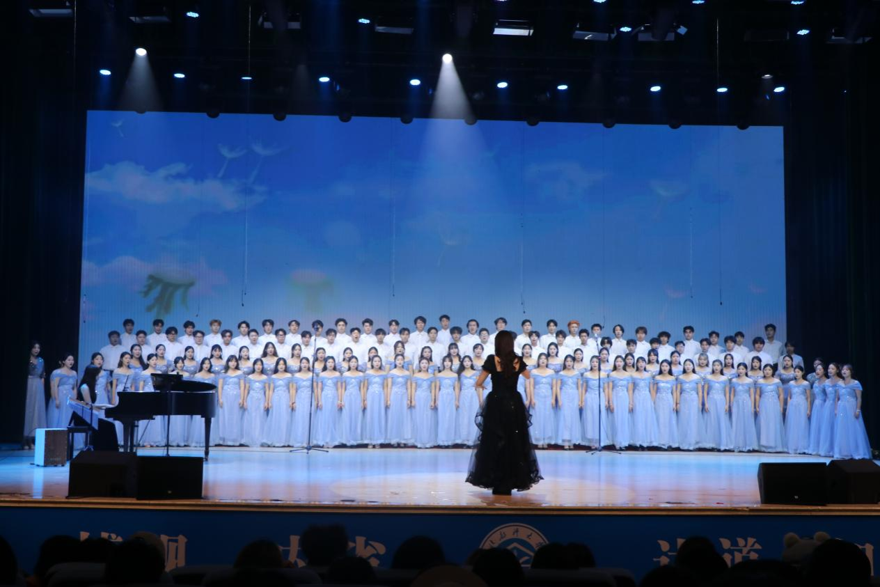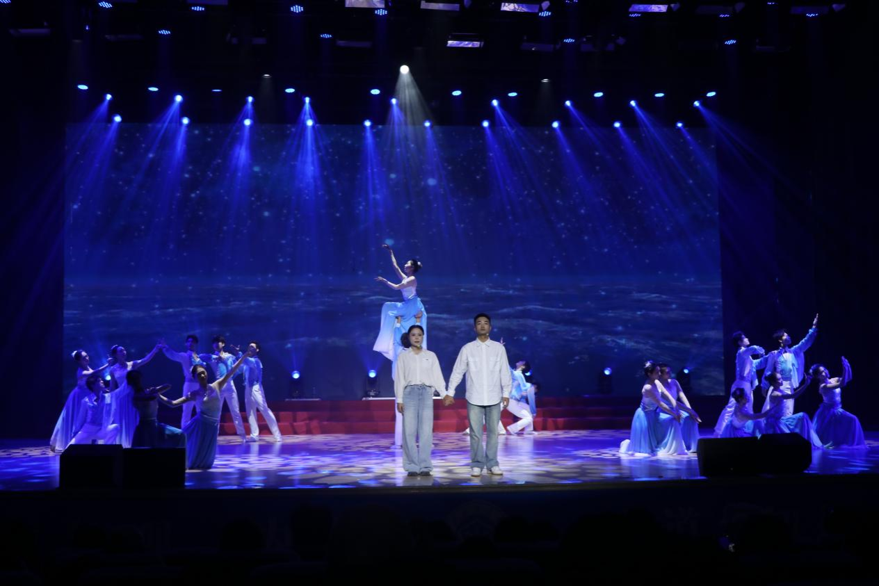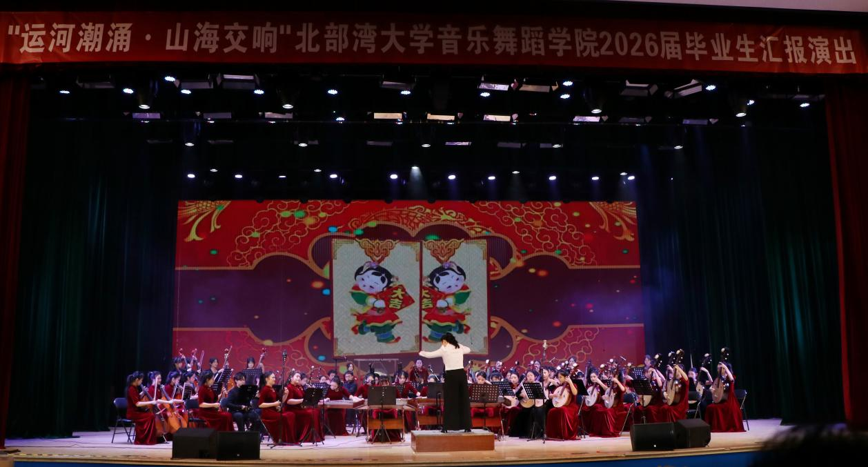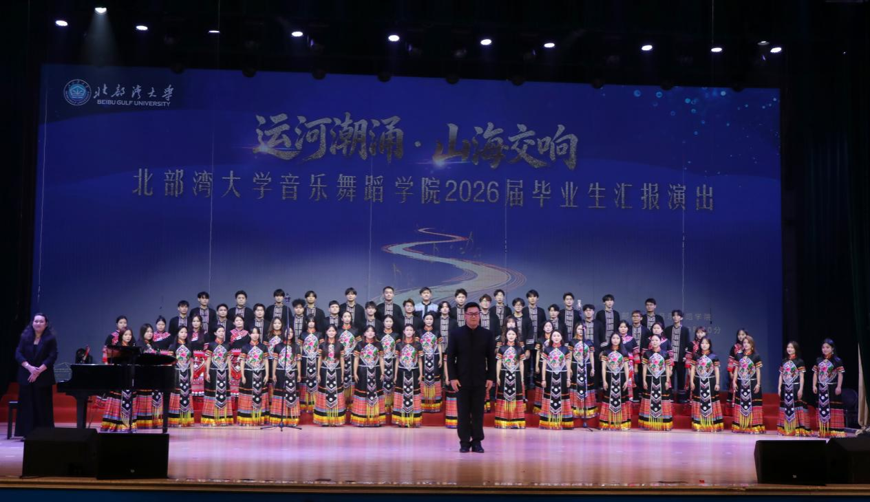本场演出分为“源自溪流·初心如磐”“帆影书香·桃李成荫”“通江达海·故土情深”“向海图强·潮头放歌”四个篇章。在欢快的开场曲《欢腾的节日》中汇演拉开帷幕。第一篇章中,合唱《小河淌水》《鸳鸯・饮江》勾勒山水意境,舞蹈《黔・行》展现地域风情,粤剧《荔枝颂》彰显非遗魅力。第二篇章通过舞蹈《游园》、钢琴独奏《浏阳河》及小组唱《挑着好日子山过山》,传递师生情谊与成长感悟。第三篇章以民乐合奏《别》、独唱《我的深情为你守候》及舞蹈《渔光曲》抒发对故乡的深深眷恋。第四篇章则聚焦时代主题,音乐剧《守鲎》选段唤起海洋保护意识,民乐合奏《云宫迅音》展现青春创意,歌曲《蒲公英》《星辰大海》唱响毕业生对未来的展望。整场汇演生动呈现了2026届毕业生从入学初萌到学成启航的成长历程,展现了音乐舞蹈学院的育人成效和办学成果,在全场齐唱校歌中圆满落幕。
