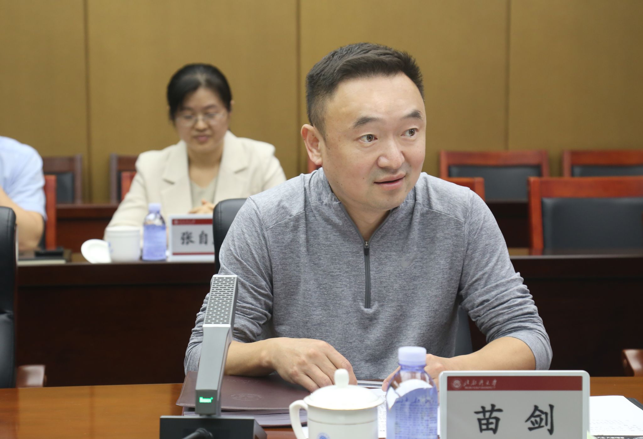 座谈会上,苗剑对王双飞院士一行的到访表示热烈欢迎,并感谢广西大学长期以来在对口支援工作中对我校发展建设的支持。他介绍了学校的发展建设情况,指出学校始终立足北部湾、服务广西、面向东盟,积极对接区域发展需求,已在海洋工程、临港产业、生态环保、食品加工等学科建设上形成鲜明特色。他表示,学校将紧抓北部湾经济区高质量发展和平陆运河建设带来的机遇,推动产业绿色转型,参与生态环境保护,深化校企协同创新,持续为区域经济社会发展注入强劲动能。他希望以此次交流为契机,进一步深化与广西大学以及优质企业在人才培养、师资队伍建设、产学研融合等方面的合作,不断提升学校科技创新能力与社会服务水平。