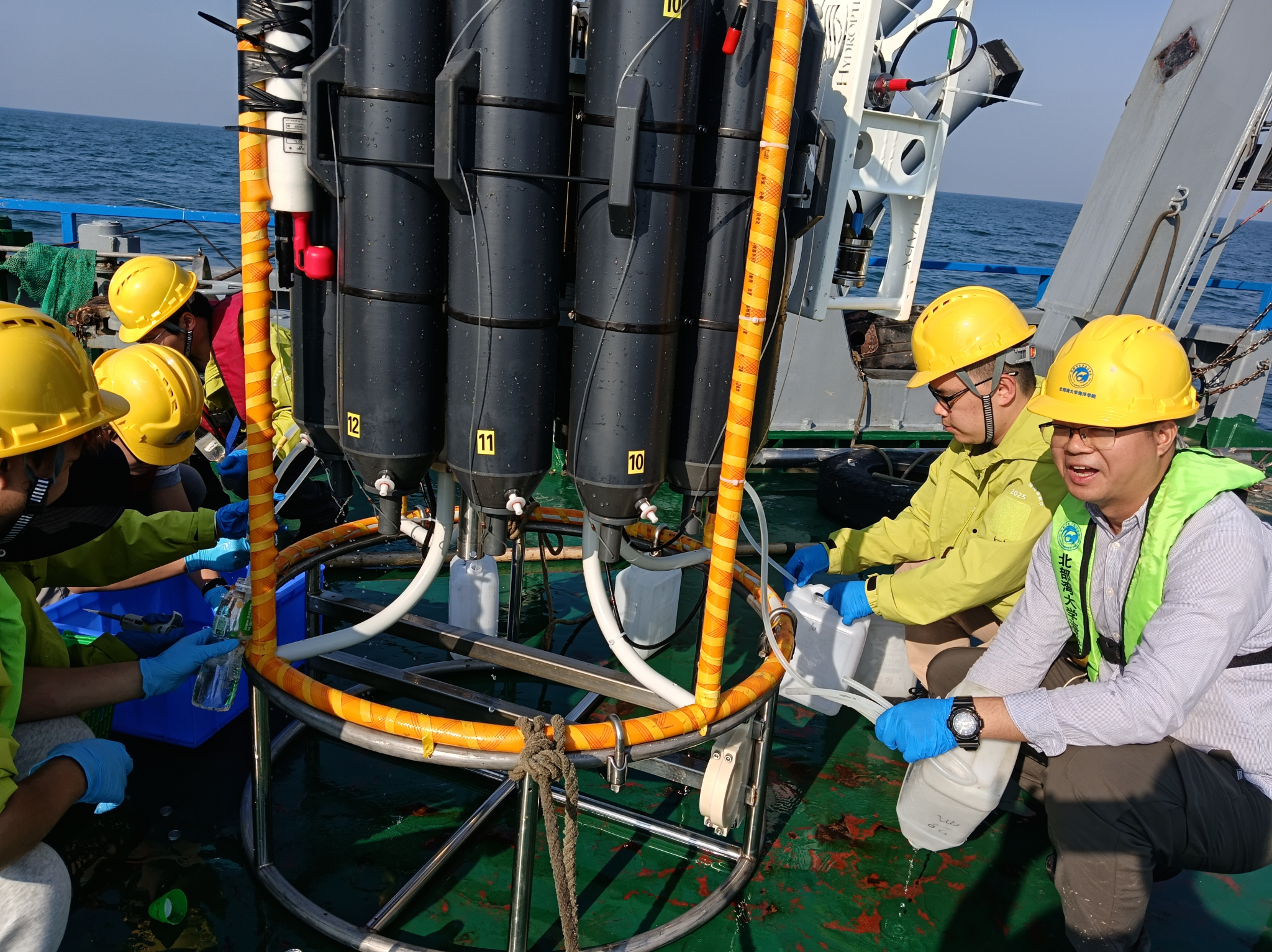 我校冬季航次科考队员在科考船上开展分层采水工作