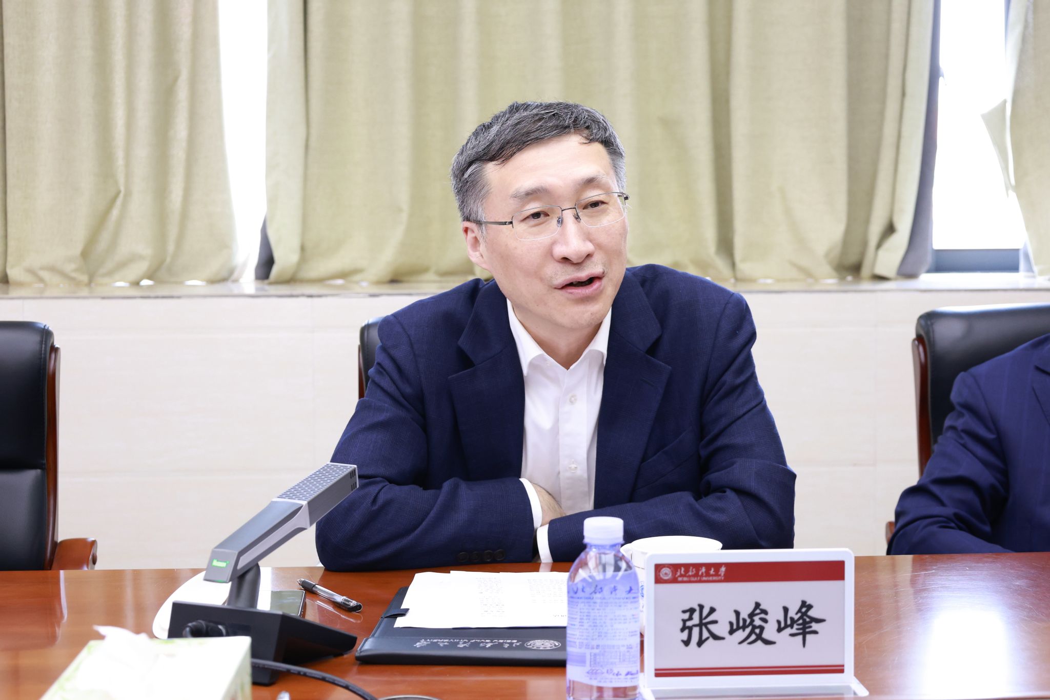张峻峰对北部湾大学的热情接待表示感谢,并介绍了中国海洋大学近年来在学科建设、人才培养、科技创新、服务社会等方面取得的发展成效,表示目前正积极筹备成立海洋高等教育共同体,期待汇聚全国涉海高校力量,共同探索海洋领域拔尖创新人才培养新模式。他指出,北部湾大学扎根钦州、立足北部湾,师范教育和涉海人才培养成效显著,科技创新势头强劲,为区域发展和国家高等教育事业贡献了智慧和力量。两校同为涉海类高校,关系密切,共同承担着服务教育强国、海洋强国建设的责任使命。他希望双方围绕海洋科技创新、陆海统筹、生态保护、平陆运河建设等战略需求,深化学科共建、人才共育、科研协同等方面的全方位高水平合作,携手为教育强国、海洋强国建设及地区高质量发展作出新的更大贡献。