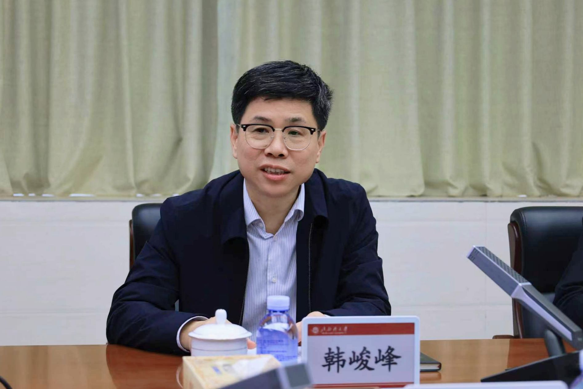 双方有关部门负责人参加座谈会。会前,韩峻峰一行实地调研参观了学校校史馆、海洋文化博物馆、航海模拟器一体化实验室、海洋生物标本馆、船海水动力实验室、红树林生态修复实验室以及坭兴陶展示厅。(周晓彤 摄)