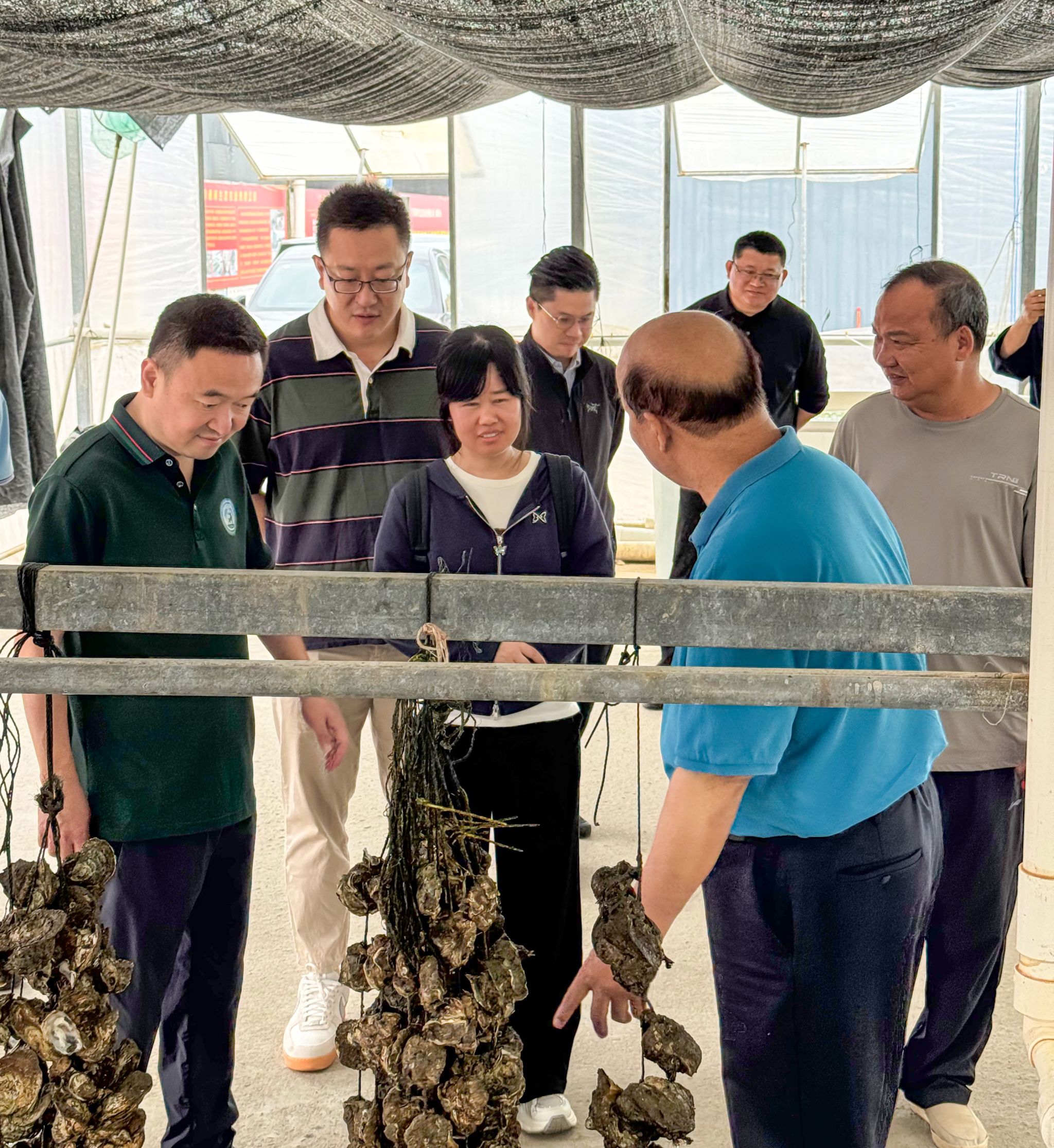 张卫东介绍了企业在苗种高效繁育、生态中间培育、亲本生态促熟等核心技术领域的突破情况,以及对虾精准高效养殖、尾水生态处理与循环利用等绿色养殖技术的产业化应用。现场还展示了我校与中国科学院海洋研究所联合研发的近江牡蛎速生耐盐新品系“广福1号”及香港牡蛎三倍体等成果。
