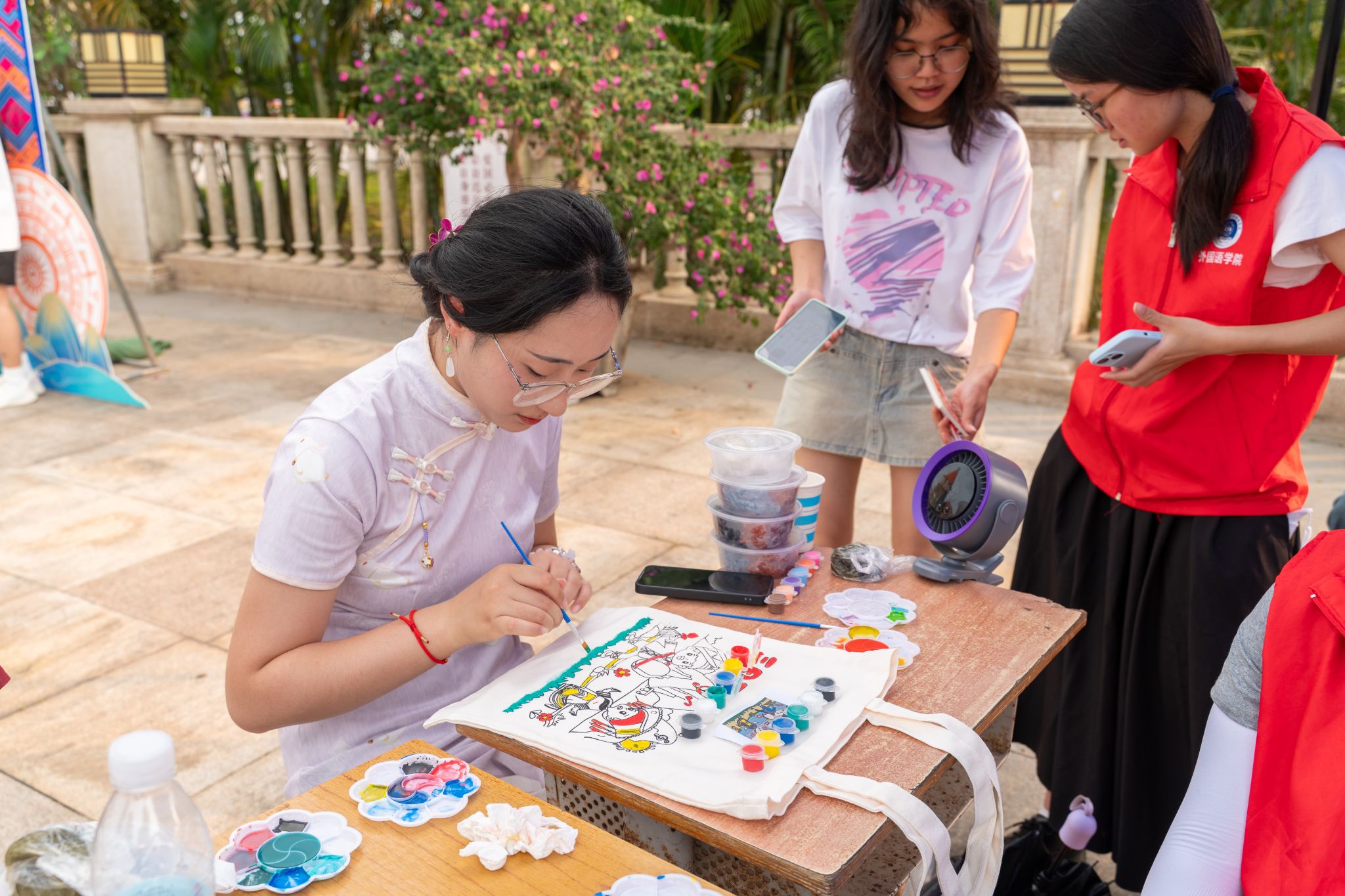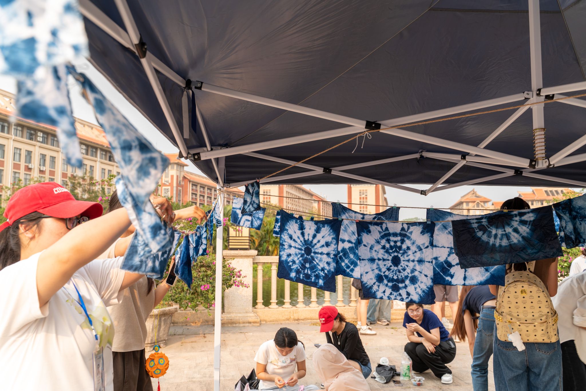 中心广场上,民族文化体验区热闹有序。板鞋竞速、投壶、滚铁环、抖空竹等民族体育项目吸引众多师生一试身手;手工绣球、扎染、香囊制作、壮锦风铃等传统手工艺体验区前也排起长队,大家在一针一线、一扎一染中感受手工技艺的魅力。民族歌舞表演环节,《山歌好比春江水》《大地飞歌》《爱我中华》等经典曲目依次唱响,师生们共唱民歌、齐跳竹竿舞,现场洋溢着浓浓的节日气氛。