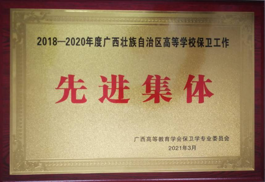 近日,从2021年广西高教保卫学会年会暨保卫学会换届大会上获悉,我校武装部(保卫处)被评为“2018-2020年度广西壮族自治区高等学校保卫工作先进集体”,武装部(保卫处)部(处)长陈达兴和国防教育科科长曹荣强分别被评为“2018-2020年度广西壮族自治区高等学校保卫工作先进个人”。