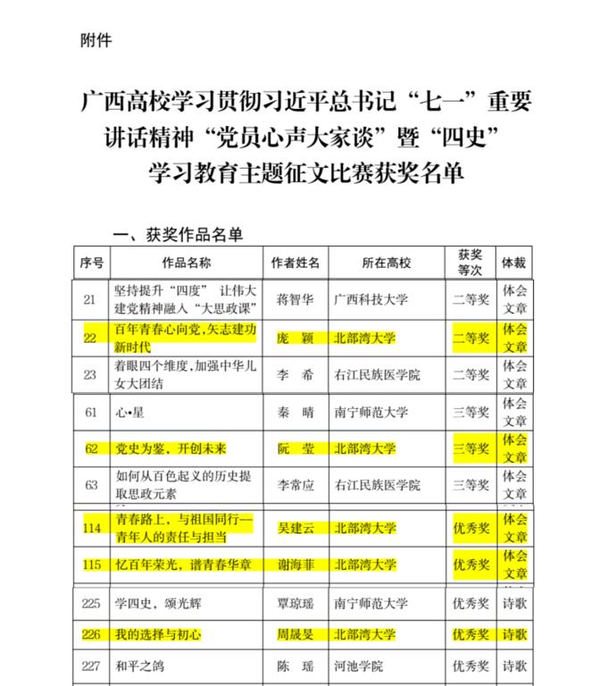 我校《百年青春心向党,矢志建功新时代》《党史为鉴,开创未来》分别获“体会文章”类二等奖和三等奖,《青春路上,与祖国同行——青年人的责任与担当》《忆百年荣光,谱青春华章》同获“体会文章”类优秀奖,《我的选择与初心》获“诗歌”类优秀奖。