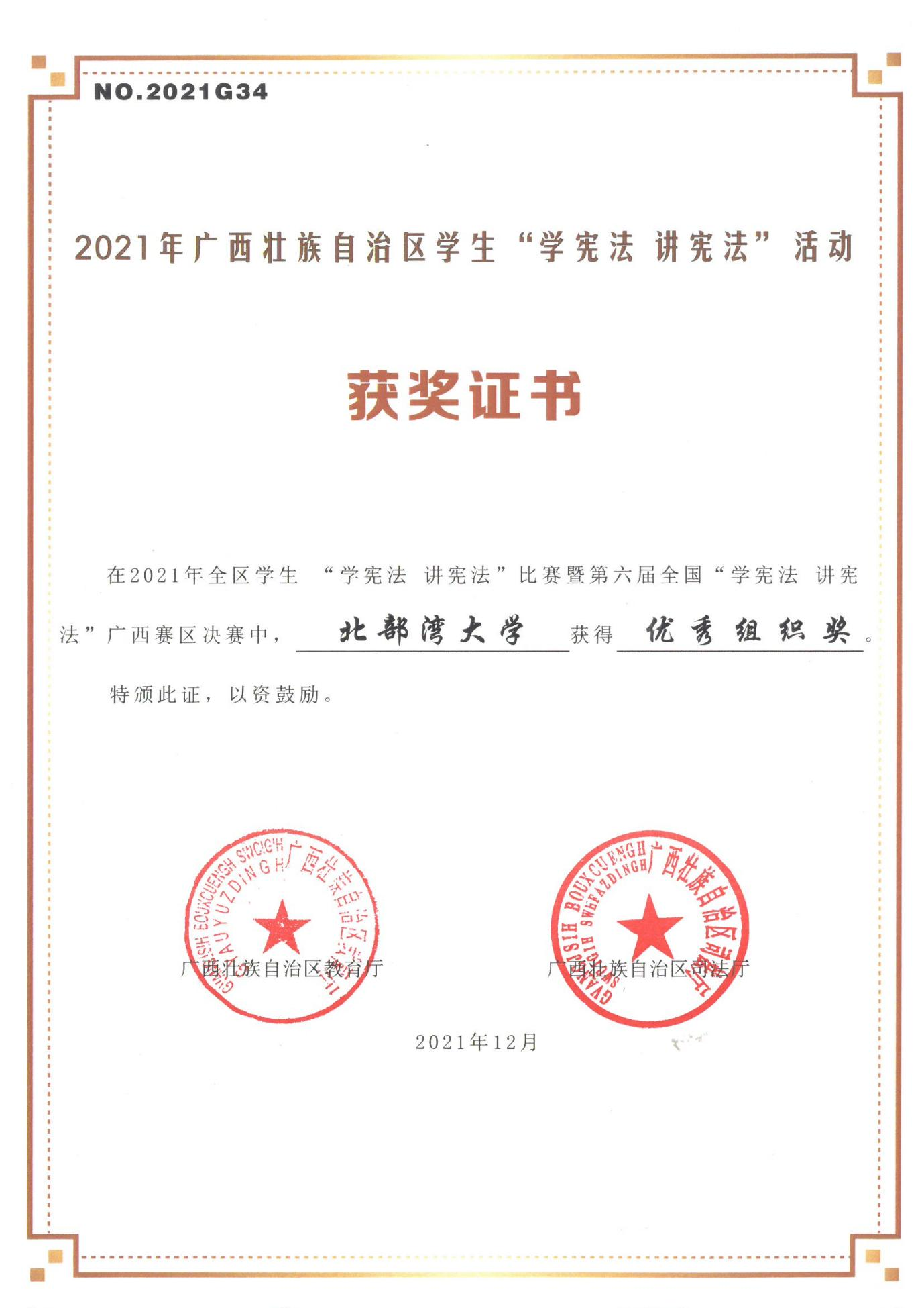 近日,从《自治区教育厅自治区司法厅关于公布2021年全区学生“学宪法 讲宪法”比赛暨第六届全国学生“学宪法 讲宪法”广西赛区决赛获奖名单的通知》获悉,我校最终以92.5%的参与率荣获优秀组织奖。