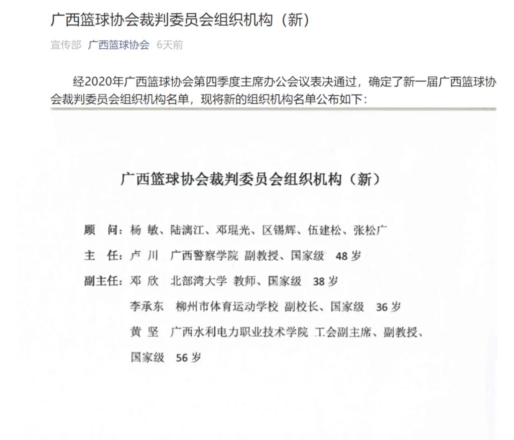 近日,在2020年广西篮球协会第四季度主席办公会议上,表决通过并确定了新一届广西篮球协会裁判委员会组织机构名单,我校体育教学部教师邓欣作为广西唯一一名CBA联赛裁判员当选广西篮球协会裁判委员会副主任。