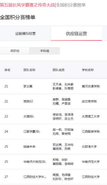 据悉,第五届长风学霸赛之传奇大战“供应链运营”项目(本科组)竞赛系全国交通运输职业教育教学指导委员会主办的行业重要赛事。旨在通过在线“游戏化”的学习方式,加强学生对现代物流、供应链的认识和理解,培养整合协调资源的能力、数据处理与分析的能力和基于分析结果解决具体问题的能力,激发学生的探索与创新精神,提升专业实践能力。