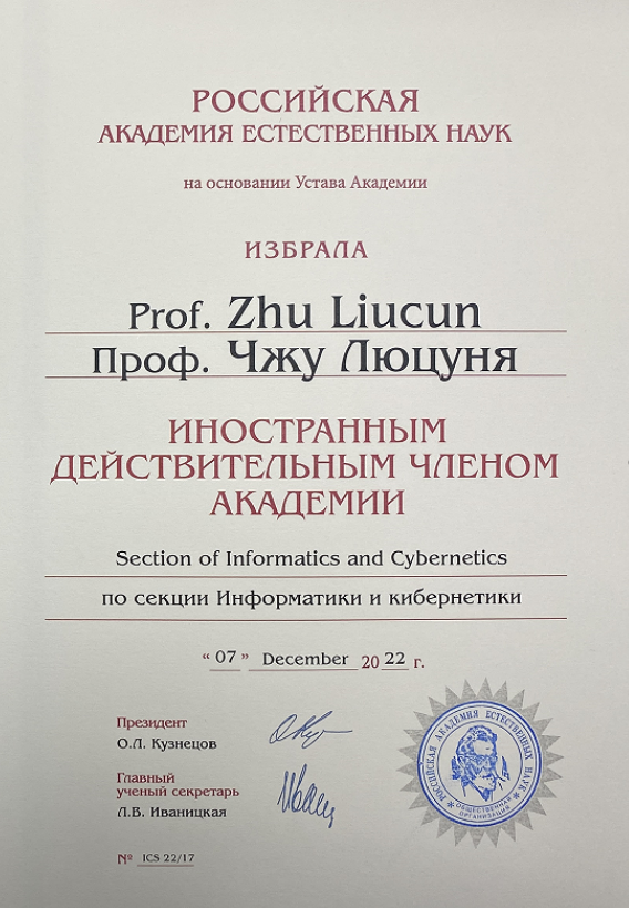 近日,经院士推荐、形式审查、材料审核、学部选举、主席团审议等流程,并通过考察候选人的学术成就、以及在相关领域的影响及地位,先端科学技术研究院朱留存教授收到了来自俄罗斯自然科学院(Russian Academy of Natural Sciences,RAEN)O.L. Kuznetsov院长发来的贺信,祝贺他当选为俄罗斯自然科学院外籍院士,并签发了院士当选证书与院士工作证书。