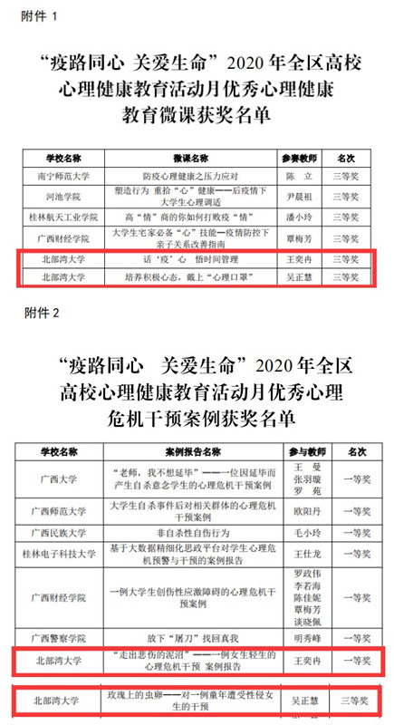 2020年,广西壮族自治区教育厅围绕“疫路同心关爱生命”的主题,开展全面心理排查、推送一批心理微课、网络辅导与电话辅导、撰写优秀心理危机干预案例等系列活动。活动开展以来,全区高校上报作品材料262件,其中“心理健康教育微课”作品104件、“心理危机干预案例报告”96件。我校王奕冉老师作品《“走出悲伤的泥沼”——一例女生轻生的心理危机干预案例报告》获“心理危机干预案例组”一等奖,《话‘疫’心悟时间管理》获“心理健康教育微课组”三等奖;吴正慧老师作品《玫瑰上的虫卵——对一例童年遭受性侵女生的干预》获“心理危机干预案例组”三等奖,《培养积极心态,戴上“心理口罩”》获“心理健康教育微课组”三等奖。