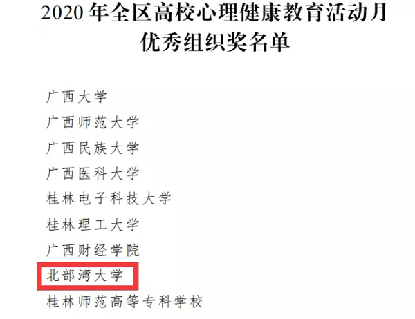 近日,从《自治区教育厅关于公布2020年全区高校大学生5·25心理健康教育活动月主题活动获奖名单的通知》(桂教思政[2020]17号)获悉,我校在全区高校大学生5·25心理健康教育活动月主题活动中获优秀组织奖,我校教师王奕冉、吴正慧共获一等奖1项、三等奖3项。