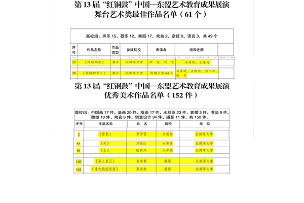 近日,由文化和旅游部科技教育司、广西壮族自治区文化和旅游厅和广西壮族自治区教育厅联合组织的第十三届(2020)“红铜鼓”中国—东盟艺术教育成果展评选活动结束。经组织专家评选(评审),我校共有7件作品获奖。