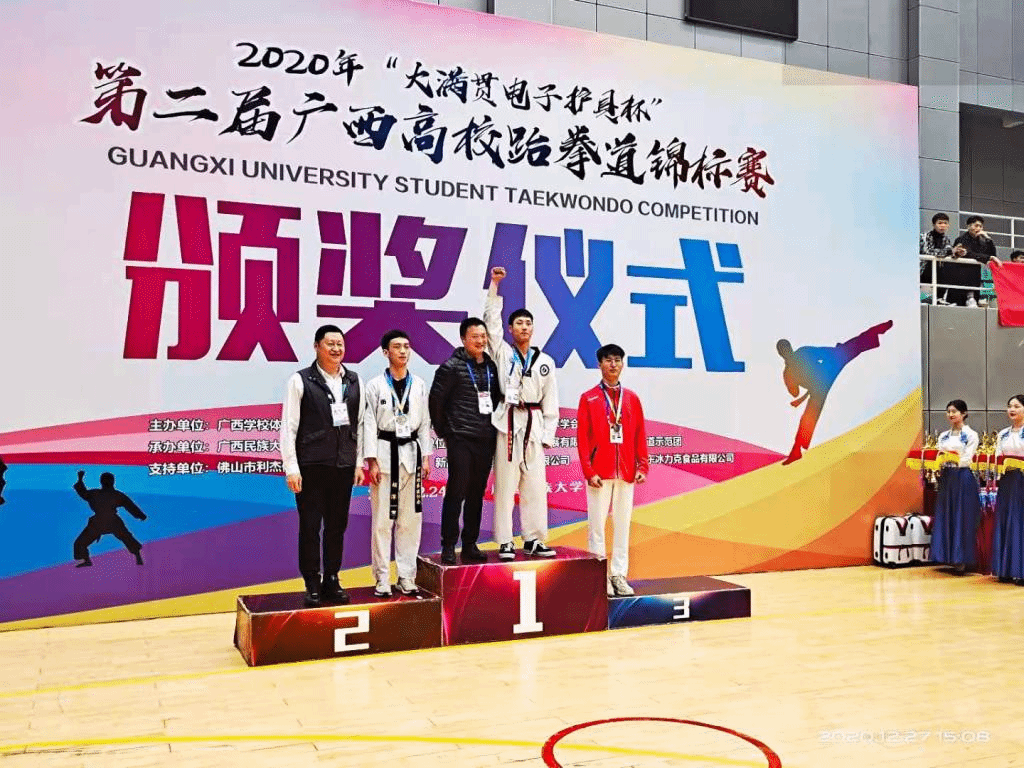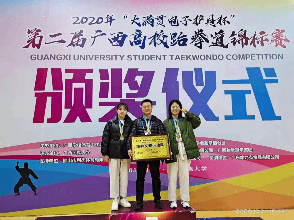 12月24至27日,2020年“大满贯电子护具杯”第二届广西高校大学生跆拳道锦标赛在广西民族大学举行。我校跆拳道队在比赛中表现出色,一举拿下3项冠军。