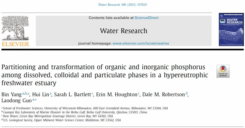 近日,我校海洋学院杨斌副教授课题组与美国威斯康星大学密尔沃基分校合作,在国际一流期刊《Water Research》(ISSN: 0043-1354)发表了题为“Partitioning and transformation of organic and inorganic phosphorus among dissolved, colloidal and particulate phases in a hypereutrophic freshwater estuary”的科研论文。该论文第二完成单位为北部湾大学,第一作者为杨斌副教授,通讯作者为杨斌副教授和郭劳动教授。