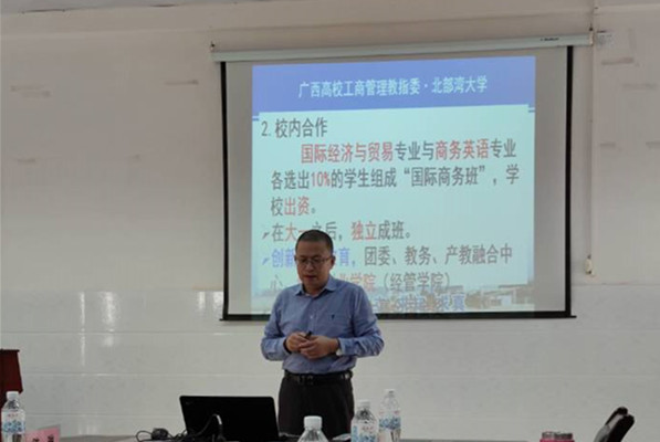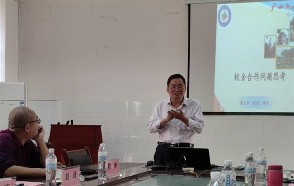 广西工商管理教指委主任委员陆奇岸教授对校企合作模式下工商管理类专业实践教学体系的构建做了探讨,并分享了广西师范大学经济管理学院校企合作方面的成功经验。马文成院长、廖东声书记、朱芳阳院长先后以“高校的使命老师的担当”“校企合作问题思考”“北部湾大学经济管理学院人才培养方案修订汇报”为题做了主题报告。随后,广西工商管理教指委委员和与会企事业代表围绕“校企合作”进行了深入的交流探讨。