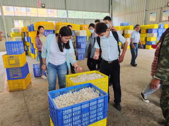 调研中,团队先后走访了那坡同益新丝绸科技实业有限公司、那坡县扶贫超市。在那坡同益新丝绸科技实业有限公司,团队成员考察了集种桑养蚕,收茧,缫丝,织布,练白,印花为一体的企业完整生产链,参观了原材料仓库、生产车间、产品展示区,详细了解企业项目实施进展、生产规模、技术管理、营销模式等工作情况,认真讨论评估群众脱贫奔康的带动效果。