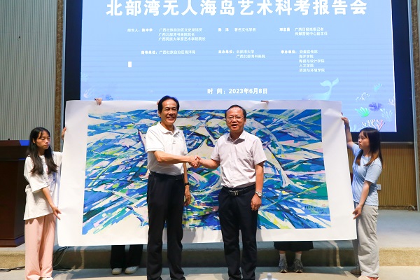 6月8日,学校在12号教学楼204报告厅与广西北部湾书画院联合举办北部湾无人海岛艺术科考报告会,并开展艺术创作交流活动。中央文史研究馆书画院研究员、民建中央画院副院长、广西文史研究馆馆员陈中华,著名文化学者彭洋,广西日报高级记者、传媒营销中心副主任邓志勇。学校副校长黄鹄出席会议。校党委常委、宣传部部长马秀明主持报告会。