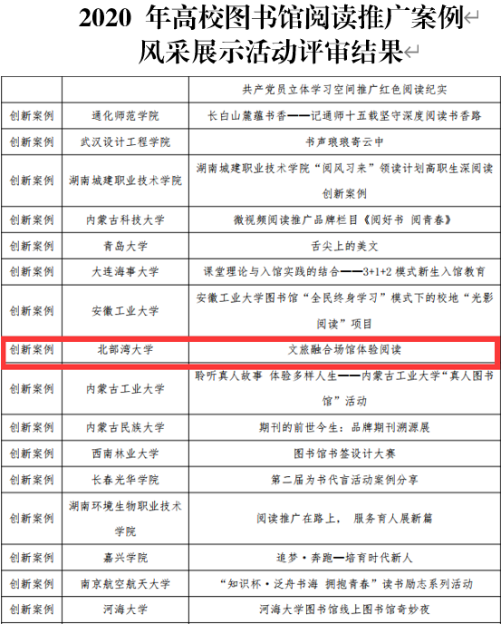 近日,由中国图书馆学会阅读推广委员会主办的2020年高校图书馆阅读推广风采展示活动圆满落幕。我校图书馆提交的《文旅融合场馆体验阅读》阅读推广案例荣获创新案例奖,是广西高校图书馆唯一获奖案例。