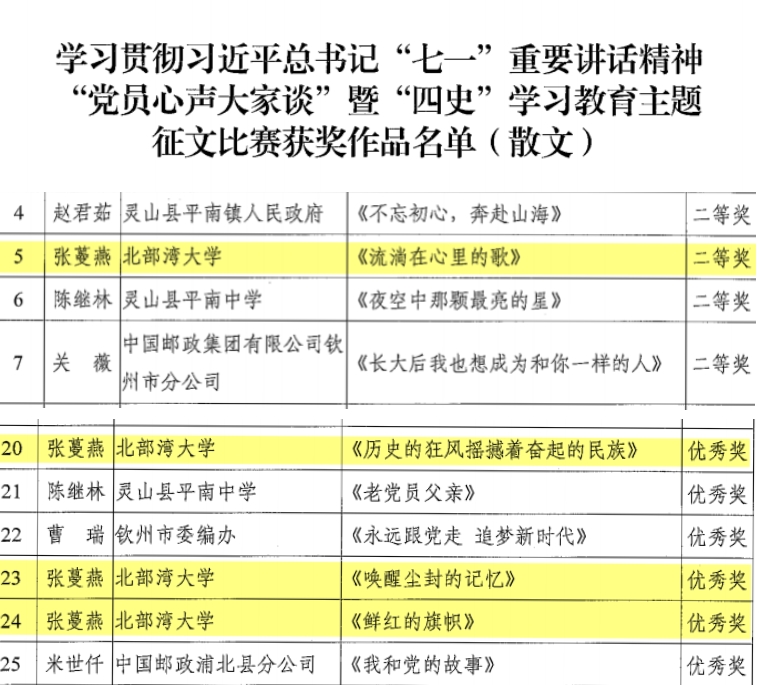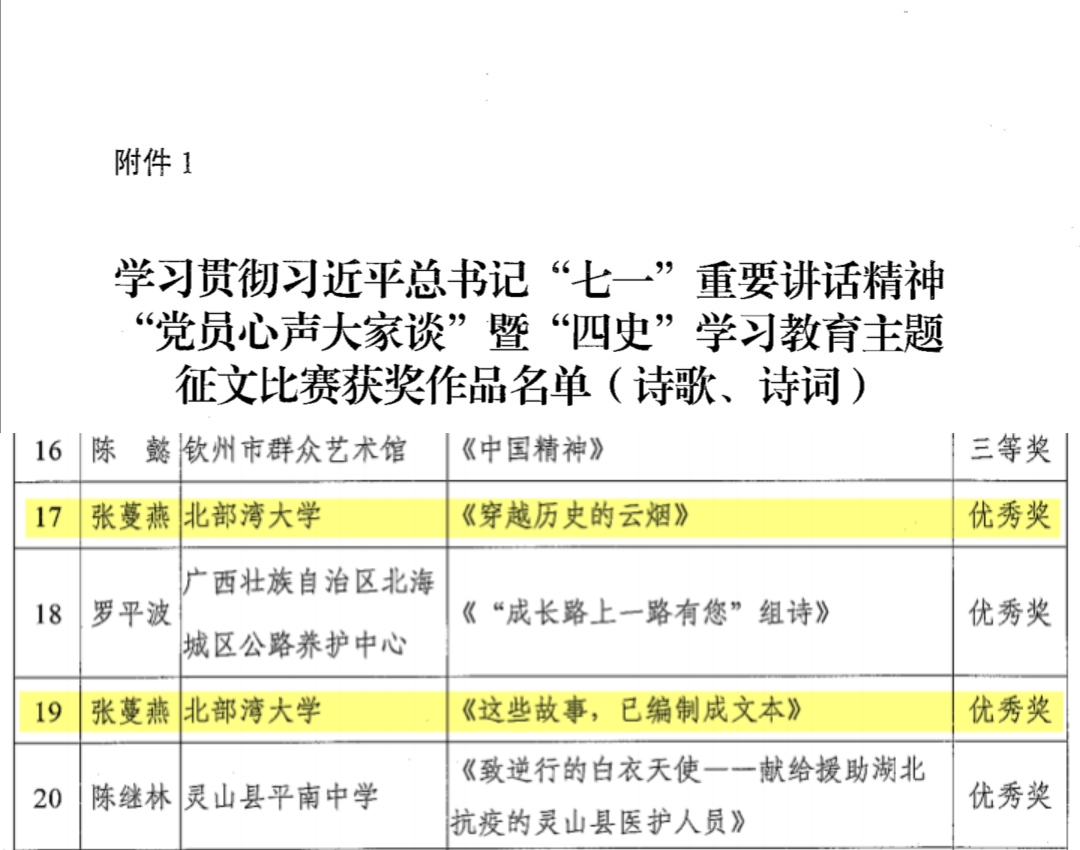 12月9日,中共钦州市委员会党史学习教育领导小组办公室、中共钦州市委员会宣传部公布了关于学习贯彻习近平总书记“七一”重要讲话精神“党员心声大家谈”暨“四史”学习教育主题征文比赛结果。在获奖的78篇优秀作品中,我校教师张蔓燕的作品《穿越历史的云烟》和《这些故事,已编制成文本》荣获诗歌、诗词类优秀奖,《流淌在心里的歌》荣获散文类二等奖,《历史的狂风摇撼着奋起的民族》《唤醒尘封的记忆》《鲜红的旗帜》荣获散文类优秀奖。