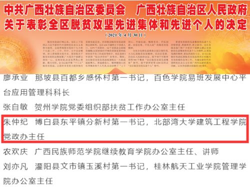 5月7日,根据中共广西壮族自治区委员会 广西壮族自治区人民政府印发《关于表彰全区脱贫攻坚先进集体和先进个人的决定》,学校建筑工程学院党政办主任、博白县东平镇分新村第一书记朱仲纪被评为“全区脱贫攻坚先进个人”。