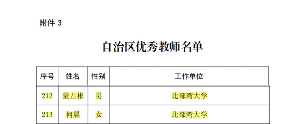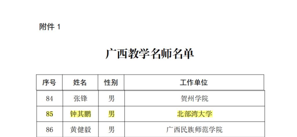 近日,从《自治区教育厅关于表彰2022年广西教学名师、特级教师、优秀教师和优秀教育工作者的决定》中获知,我校教师钟其鹏获评广西教学名师,蒙占彬、何晨获评自治区优秀教师。
