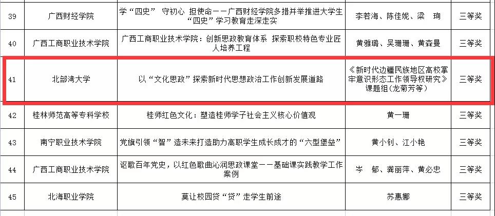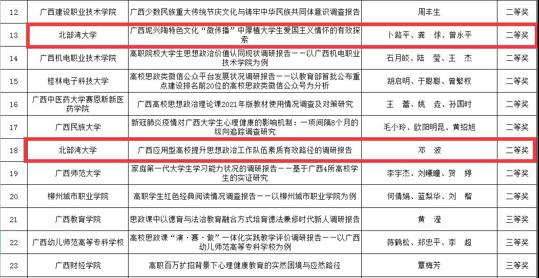 11月12日,自治区教育厅公布2021年全区高校思想政治工作优秀调研报告和工作案例获奖名单,我校教师卜路平主持撰写的《广西坭兴陶特色文化“微传播”中厚植大学生爱国主义情怀的有效探索》、邓波主持撰写的《广西应用型高校提升思想政治工作队伍素质有效路径的调研报告》分别荣获2021年全区高校思想政治工作优秀调研报告二等奖,龙菊芳等主持撰写的《以“文化思政”探索新时代思想政治工作创新发展道路》荣获2021年全区高校思想政治工作优秀工作案例三等奖。