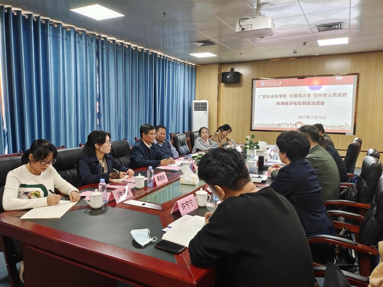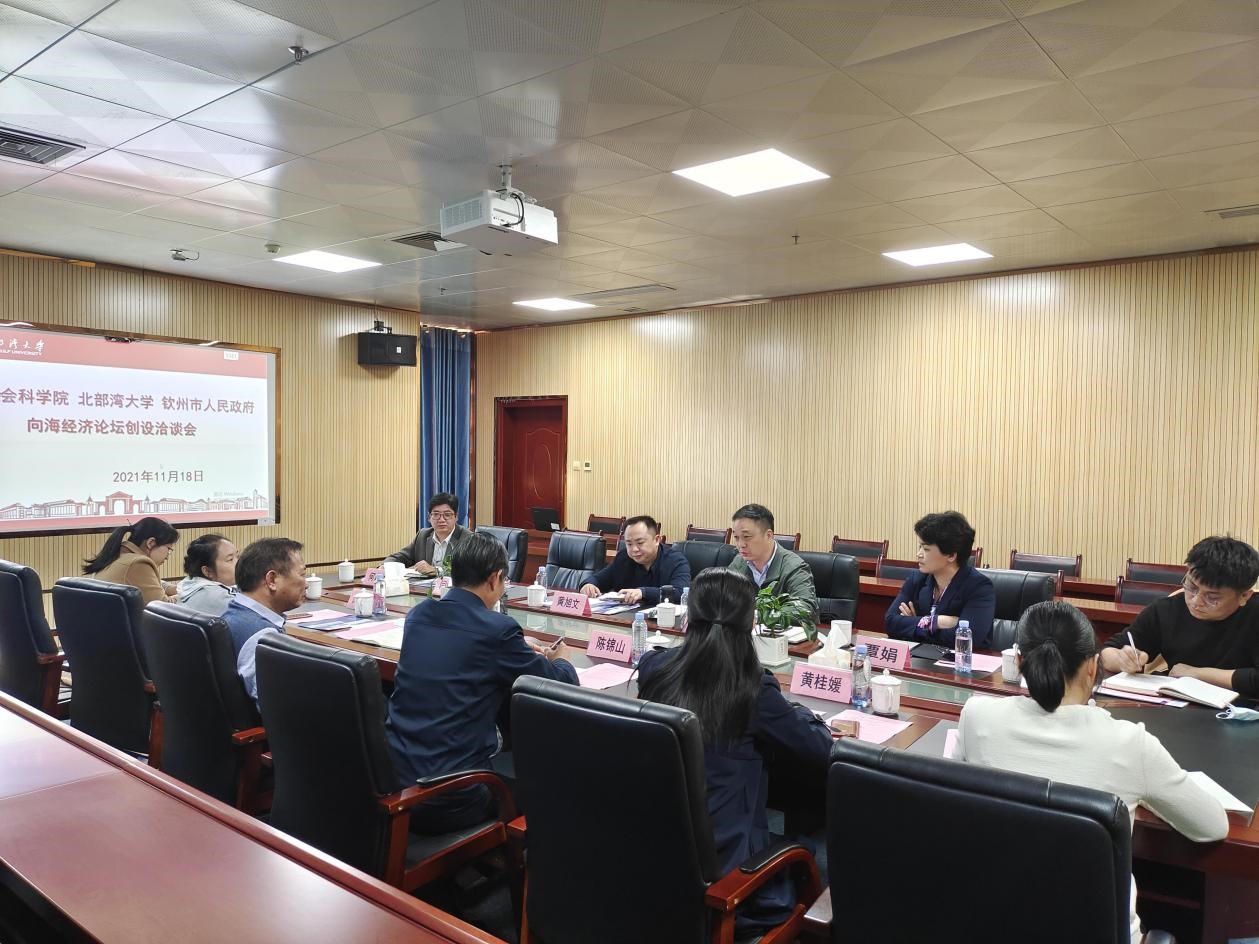 11月18日下午,我校与广西社会科学院、钦州市海洋局共同商讨创设首届向海经济论坛。洽谈会在钦州发展研究院816s会议室召开,学校党委副书记、钦州发展研究院院长陈锦山出席并讲话,钦州发展研究院常务副院长、教授傅远佳主持会议。