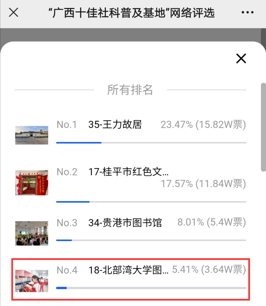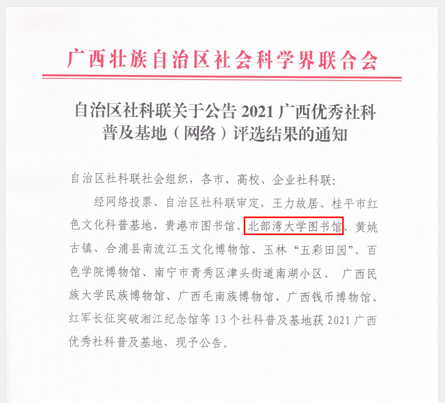 9月26日,广西壮族自治区社科联公布了2021年广西优秀社科普及基地(网络)评选结果。我校图书馆在全区网络投票中获得第四名的好成绩,荣获“2021广西优秀社科普及基地”称号。据悉,全区共43个社科普及基地参与网络评选。经网络投票、自治区社科联审定,最终有13个社科普及基地获2021年广西优秀社科普及基地。