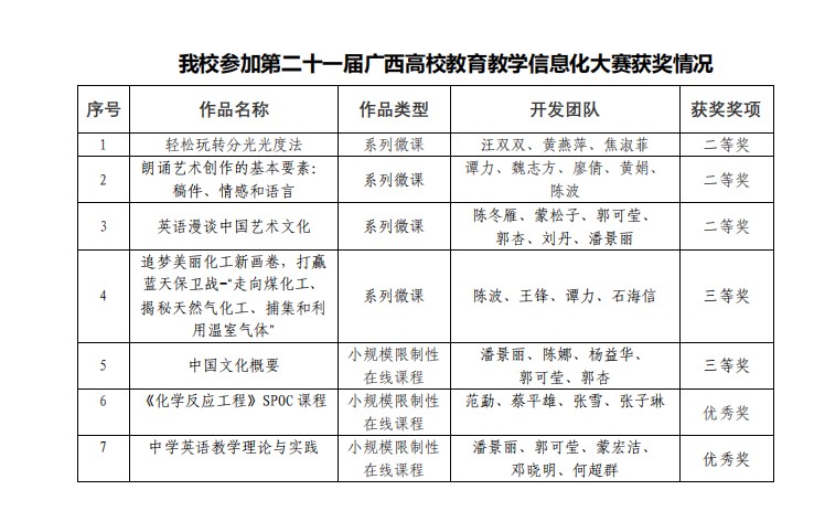 11月19日至21日,由广西教育厅主办的第二十一届广西高校教育教学信息化大赛在贺州学院举行。我校组织线上参赛,喜创佳绩,选送作品荣获大赛二等奖3项,三等奖2项,优秀奖2项。