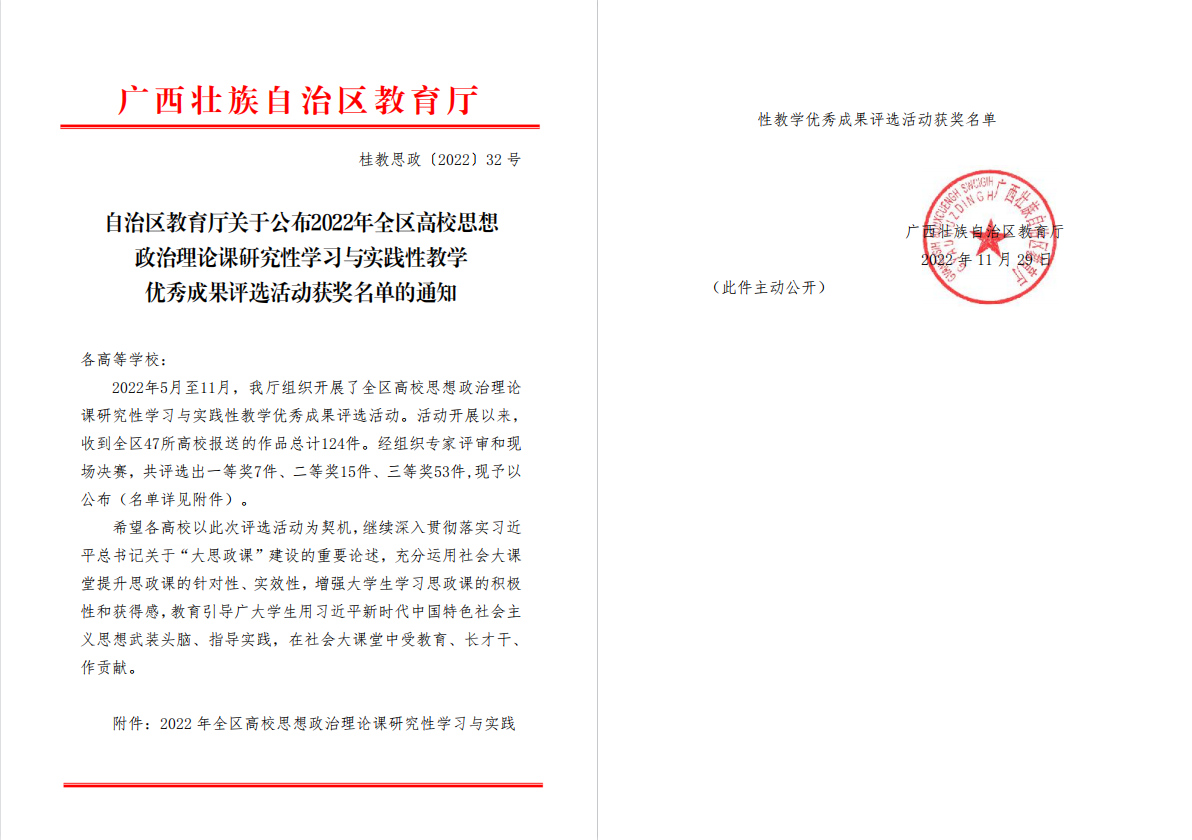 近日,广西壮族自治区教育厅发布了“桂教思政”([2022]32号)文件,公布了2022年度全区高校思想政治理论课研究性学习与实践性教学优秀成果评比结果。我校马克思主义学院所组织的师生团队在此次活动中喜获佳绩,在全区有47多所高校参加并提交的140多项研究性与实践性教学成果中,获得了一等奖一项、二等奖一项、三等奖两项。