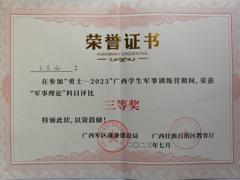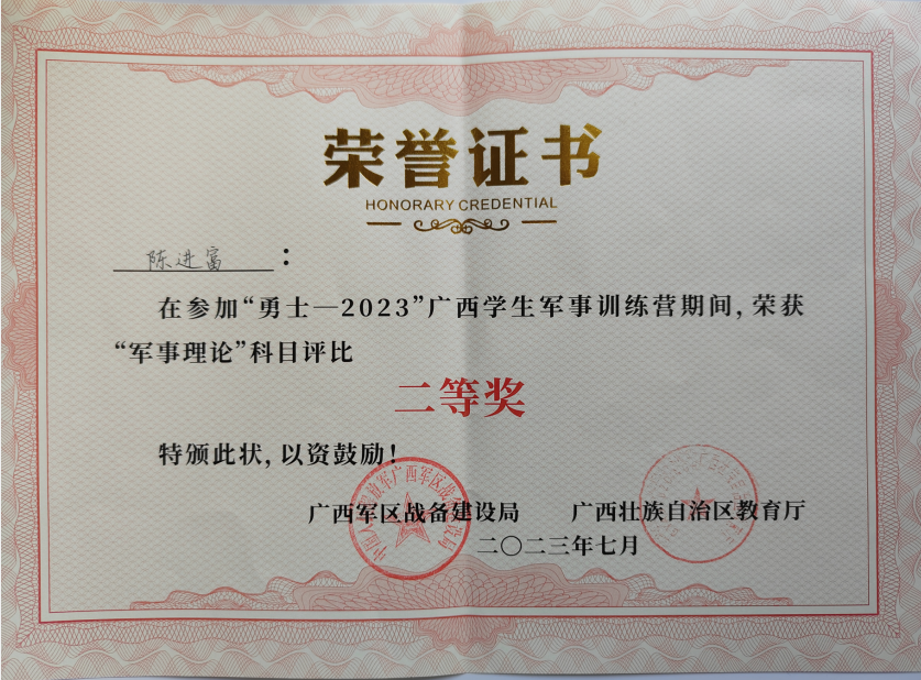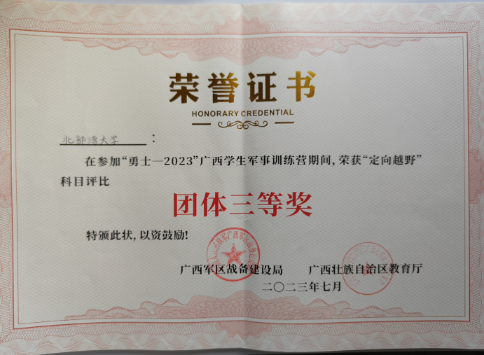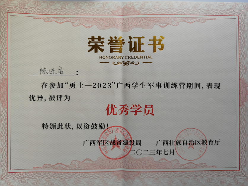 7月16日至23日,“勇士—2023”广西学生军事训练营在柳州市举行,经过激烈角逐,我校荣获“定向越野”等团体项目三等奖,“文艺汇演”第四名,海运学院轮机本221班陈进富、船电本222班王昱涵同学分获“军事理论”科目评比二、三等奖,陈进富同学被评为“优秀学员”。