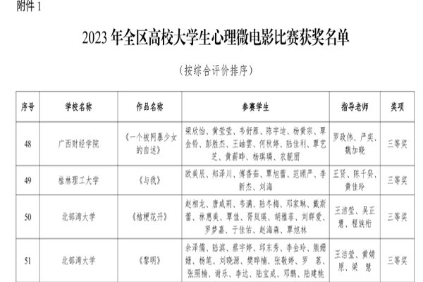 近日,自治区教育厅公布了2023年全区高校大学生“3·25”心理健康教育活动季获奖名单,在全区报送的102件心理微电影作品中,我校报送的两部心理微电影作品《桔梗花开》和《黎明》在大赛中均获三等奖。