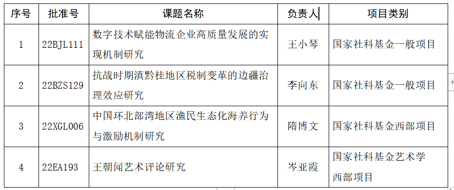 近日,全国哲学社会科学工作办公室、全国艺术科学规划领导小组办公室分别公布了2022年度的国家社科基金项目和艺术学项目立项名单,我校4个项目喜获立项。具体立项名单如下: