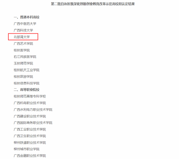 据悉,共20所高等院校被认定为第二批自治区级深化创新创业教育改革示范高校,包括广西中医药大学、北部湾大学等10所普通本科高校、桂林师范高等专科学校等10所高等职业院校。