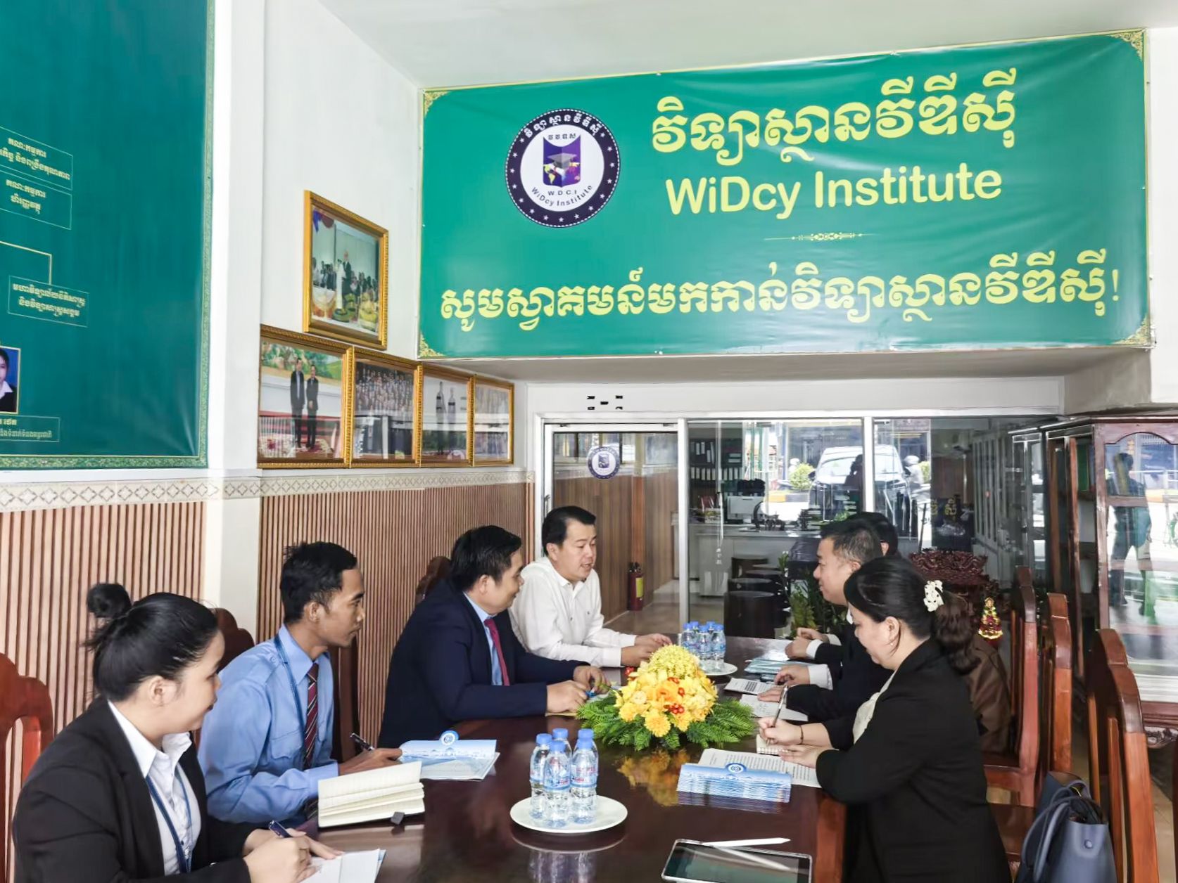 在柬埔寨WiDcy学院,闫松银一行与分管WiDcy学院的柬埔寨教育部副部长CHUON CHIVIN博士以及WiDcy学院院长进行会谈。闫松银介绍了学校的办学特色、学科建设成果,希望双方在海洋、运河、环境、教育、管理化工、电子信息和船舶制造等领域,通过联合培养项目、学术交流平台搭建及科研合作等方式,深化合作关系,共同培养具有国际视野的高素质应用型人才。