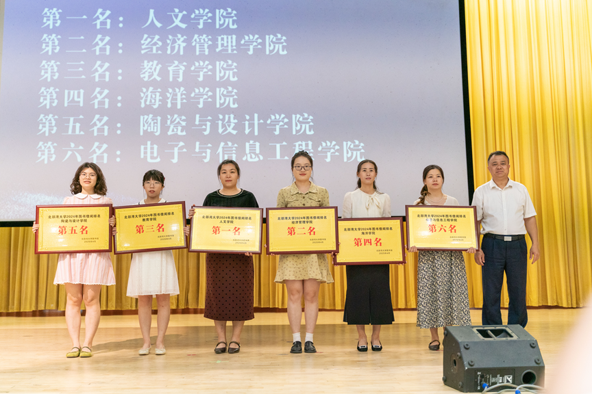 与会领导嘉宾为北部湾大学2024年度借阅排行前六名的学院、2024年度入馆人次排行前六名的学院以及2025年寒假阅读活动获奖个人进行了颁奖,表彰他们在阅读推广中的突出表现。