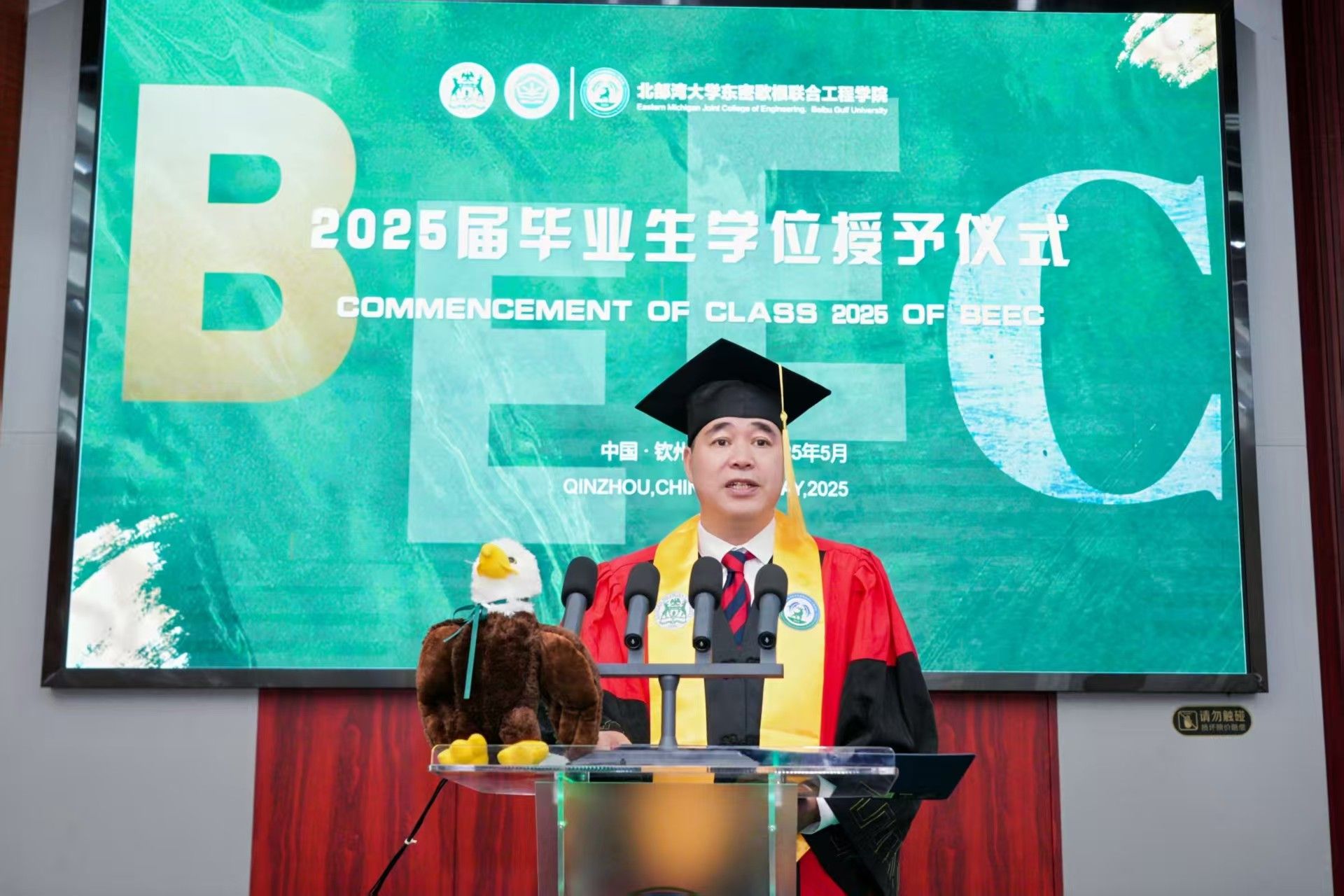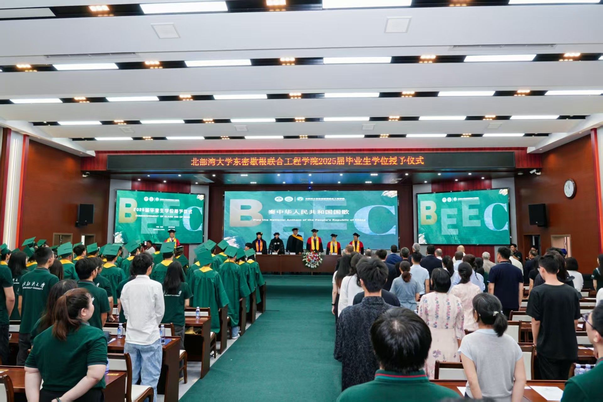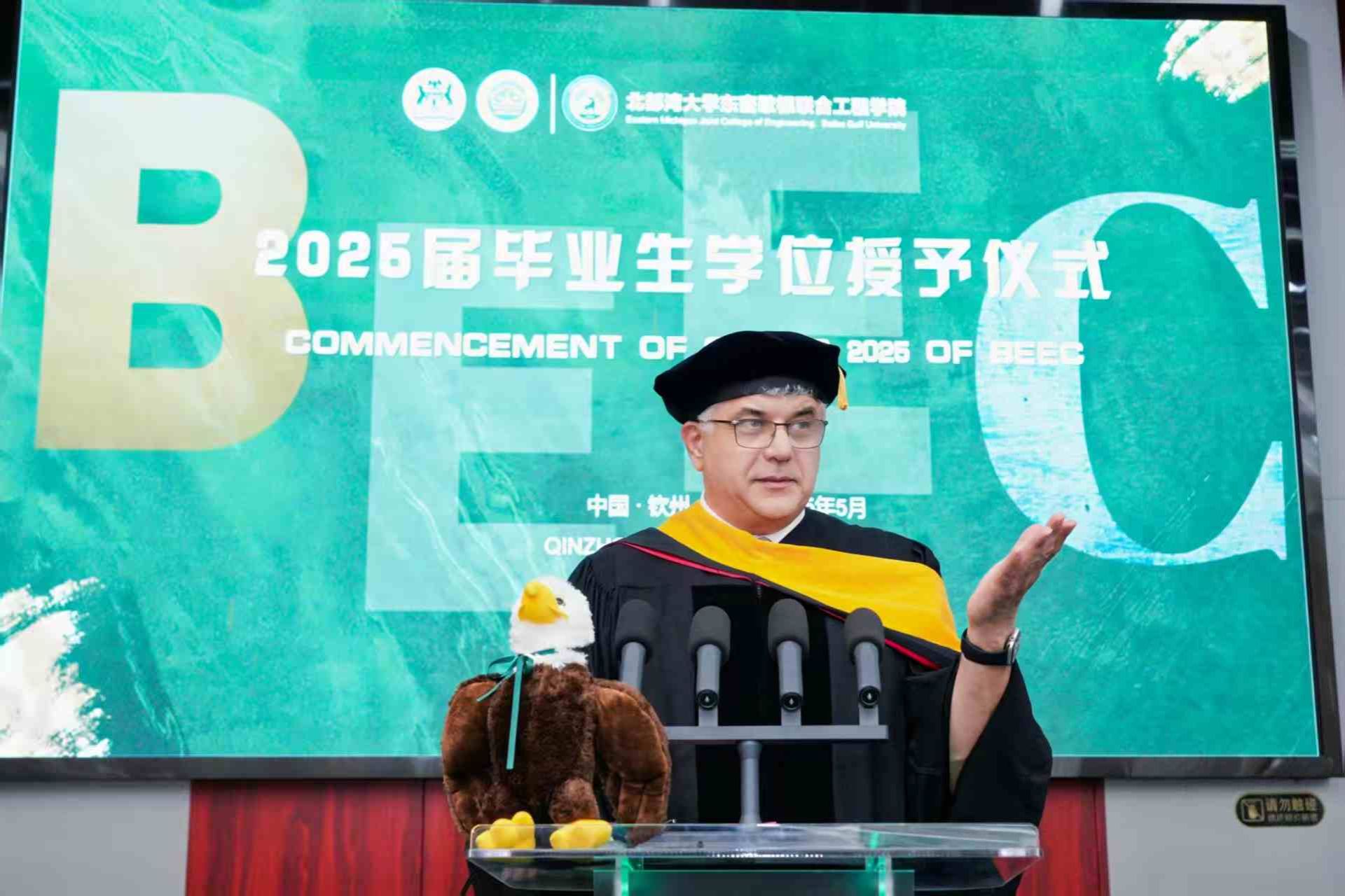 5月30日上午11时,北部湾大学东密歇根联合工程学院2025届东密歇根大学学位授予仪式在办公楼一楼报告厅隆重举行。这是北部湾大学东密歇根联合工程学院首届毕业生。首批获得东密歇根大学学士学位的40多名毕业生代表身着学位服,与北部湾大学和东密歇根大学两校师长、亲朋好友及学院师生共同见证接受学位授予的荣誉时刻。