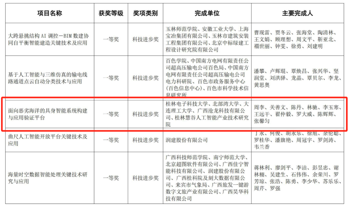 近日,2025年度八桂人工智能科学技术奖评选结果揭晓,我校作为主要完成单位申报的《面向恶劣海洋的具身智能系统构建与应用验证平台》项目荣获科技进步奖一等奖。该奖项由广西人工智能学会设立,是广西人工智能领域权威学术奖项,旨在表彰为技术革新与产业应用做出卓越贡献的科研集体。
