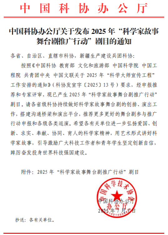 据悉,“科学家故事舞台剧推广行动”是中国科协、教育部、文化和旅游部、中国科学院、中国工程院、共青团中央、中国文联共同实施的“科学大师宣传工程”的重要组成部分,旨在通过艺术形式生动讲述科学家故事,大力弘扬爱国、创新、求实、奉献、协同、育人的科学家精神,引导激励广大科技工作者和青年学生坚定创新自信,踔厉奋发投身世界科技强国建设。2025年“科学家故事舞台剧推广行动”剧目共有来自全国高校和研究院所的218部作品入选。