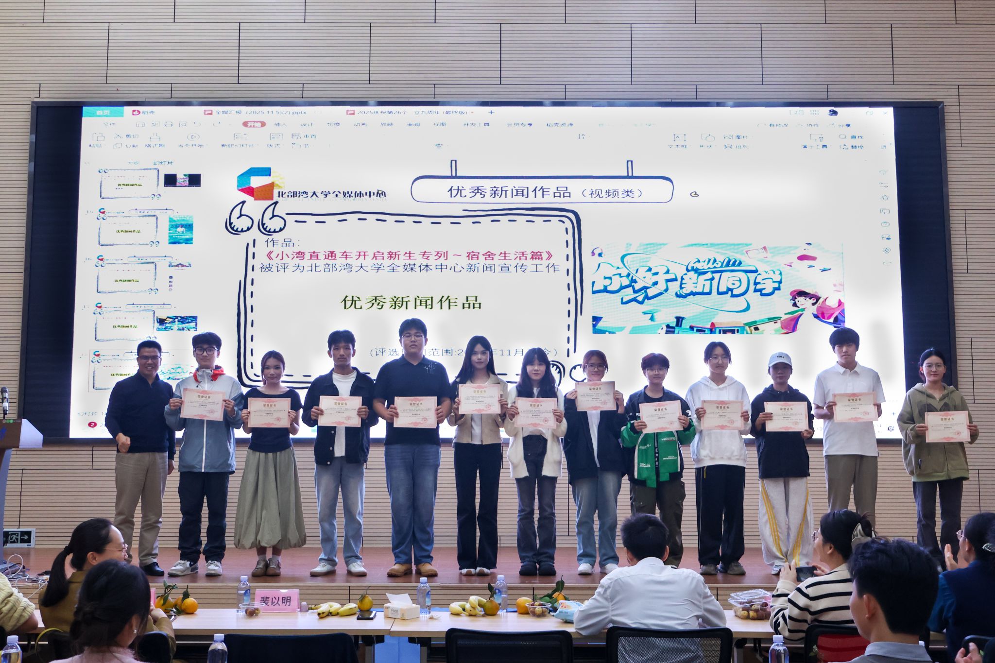 校党委常委、宣传部部长裴以明(左一)为优秀新闻作品颁奖