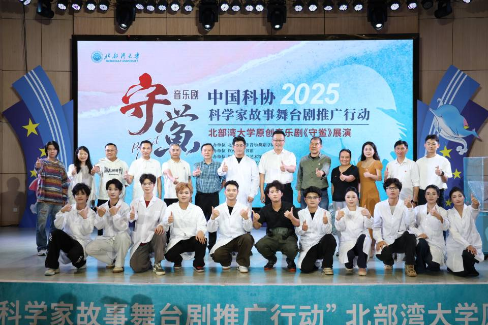 《守鲎》聚焦北部湾珍稀物种中华鲎的保护,以学校廖永岩教授及其团队真实事迹为原型,融科研探索、生态保护与家国情怀于一体,深刻地诠释了新时代科技工作者“把论文写在祖国大地上”的使命担当。全剧通过动人旋律和戏剧张力,传递“保护者得益、百姓有生计”的可持续保护理念,将科学精神与生态文明价值融入艺术表达,使观众在沉浸体验中感受科技工作者的奉献精神,让学生在参演过程中领悟科学家精神的深刻内涵,激发青年学子投身海洋强国建设的志向。据悉,该剧经北部湾大学科学技术协会推荐,入选中国科协2025年“科学家故事舞台剧推广行动”优秀剧目。