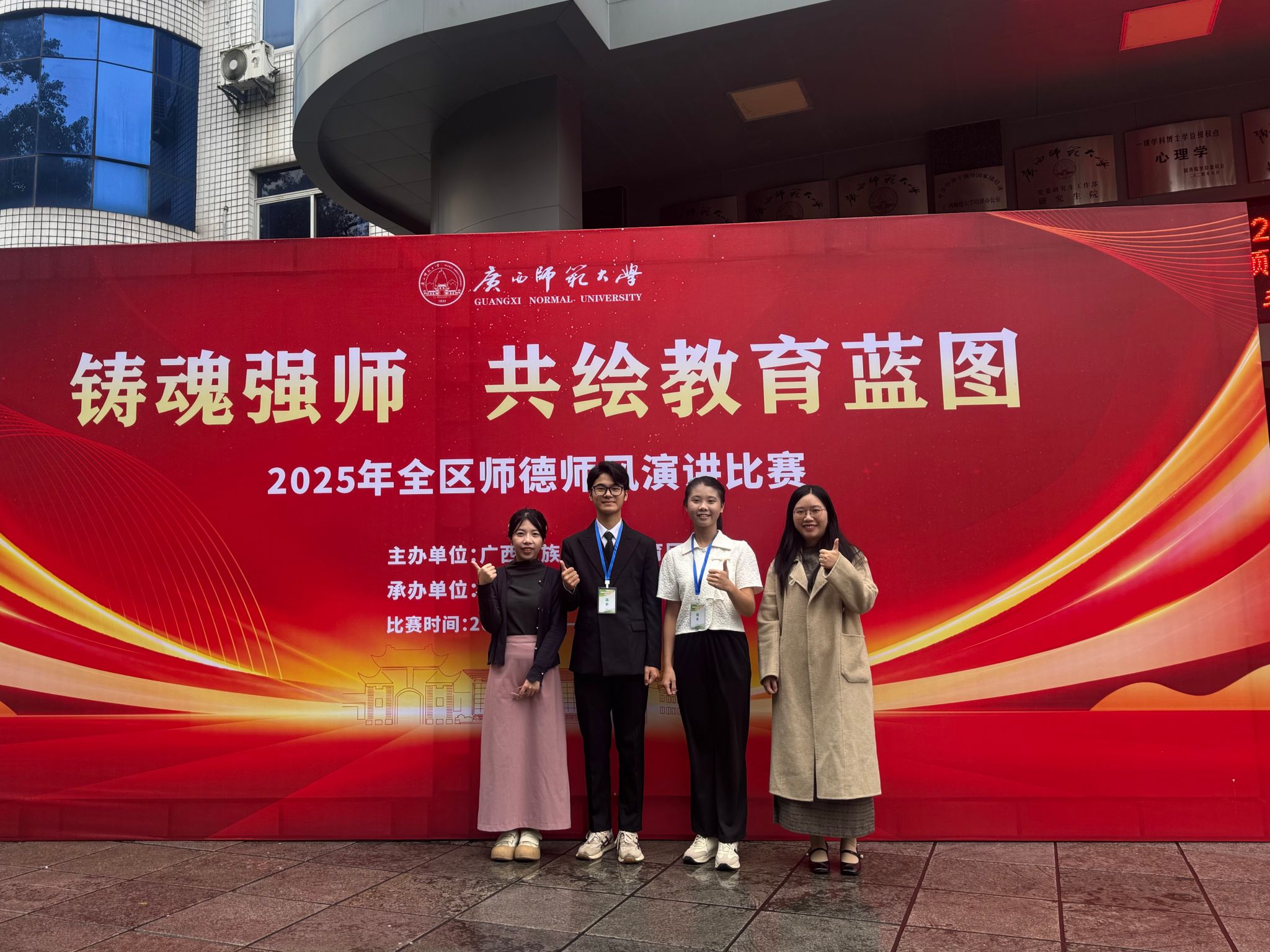 11月8日至9日,由广西壮族自治区教育厅主办的2025年全区师德师风演讲比赛决赛在广西师范大学育才校区举行。我校教育学院小学教育专业242班胡惠岚同学荣获高校师范生组三等奖,此前还作为选手代表在决赛开幕式上发言。