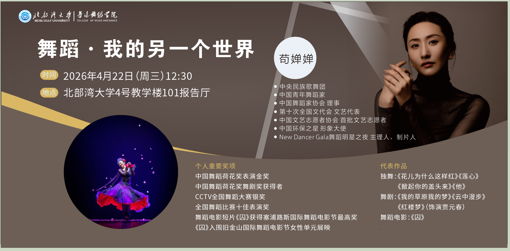 主讲人:苟婵婵,中国青年舞蹈家,中国舞蹈家协会理事,第十次全国文代会文艺代表,中国文艺志愿者协会首批文艺志愿者,中国环保之星形象大使,New Dancer Gala舞蹈明星之夜主理人、制片人