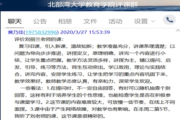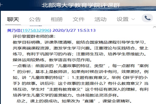 为了更好的进行线上教学,提高线上教学的质量,北部湾大学教育学院于3月27日下午通过QQ群课堂举行了线上教学经验交流会,由翁少娟副院长主持。