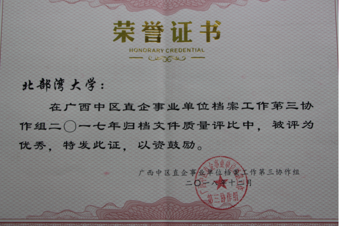 近年来,我校高度重视档案工作的发展,认真贯彻落实国家档案法律法规,不断完善档案事业投入机制,加大对档案工作的支持保障力度,努力开创档案工作规范管理的新局面;档案部门积极应对新形势下档案管理面临的新问题,围绕学校转型发展、创建北部湾大学的中心任务开展工作,以档案工作更好地为教学、科研、管理等各项工作服务为重要抓手,不断加强“三个体系”建设,推进管理的制度化、规范化和现代化建设,档案工作的各项业务水平得到全面提升。自2009年以来,在由自治区档案局举行的文件归档质量评比活动中,我校每年均被评为优秀。